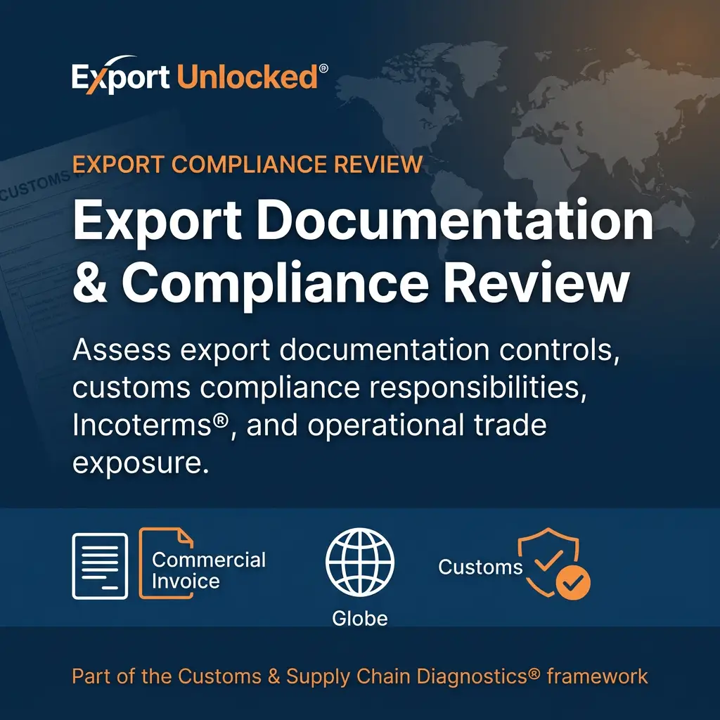This Export Documentation & Compliance Review is designed to help businesses assess their current export documentation procedures, operational controls, customs responsibilities, and compliance governance across international trade activities.